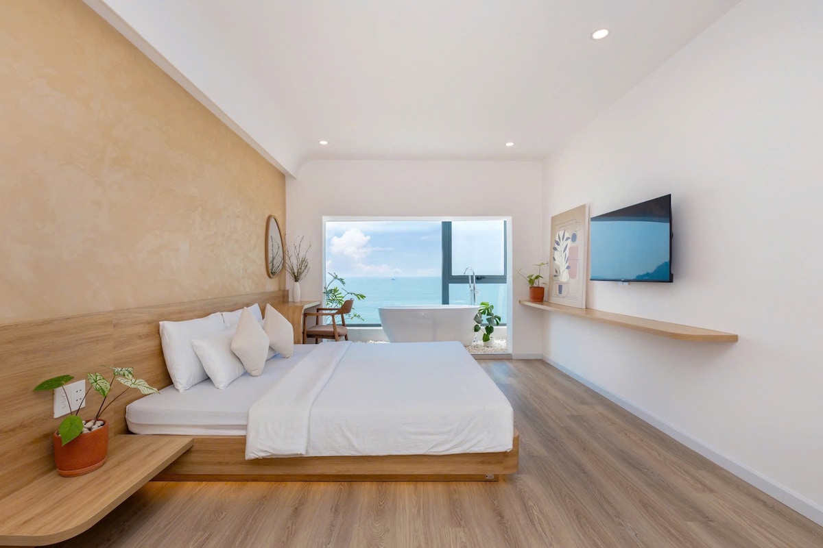 Minimalist, fully furnished 1BR apartment on the 15th floor with spectacular sea views. Ideal for couples or families with one child under 5. Perfectly located beside the Back beach (Thuỳ Vân beach). Estimated walking times to nearby amenities: - 2 minutes to reach the beach across the street - 5 minutes to the nearest 24/7 convenience store (GS25) - 8 minutes to the nearest supermarket (Lotte Mart) Fast elevators. Free Netflix. We also have one motorbike available for rent.