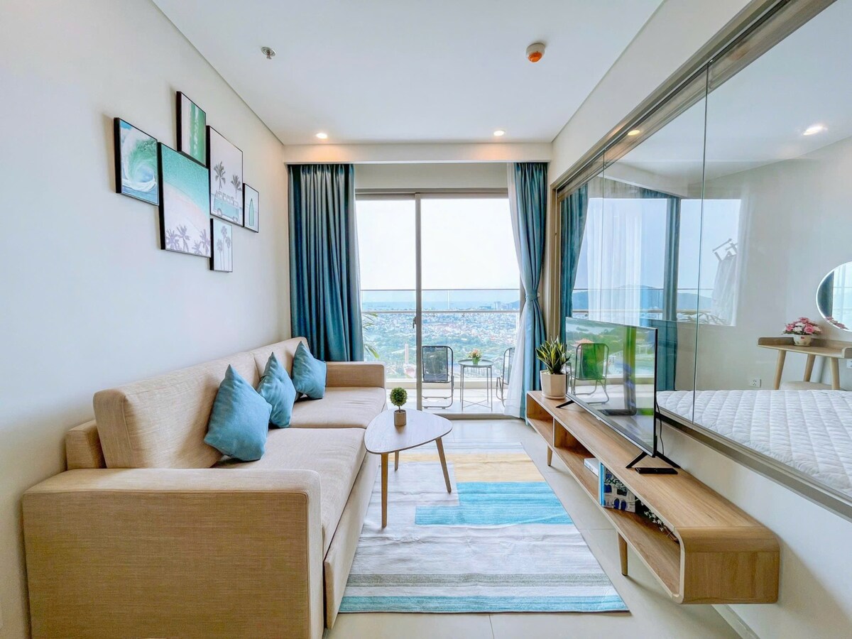 Our apartment has 1 living room, dining space, 1 bedroom (1 double bed and sofa bed), 1 bathroom and the balcony. - The bedroom: Our view from the bedroom is romantic with the view of the grand hill shimmering. We provide air-conditioner, the bed topper, and the bolster. - Kitchen: necessary facilities is provided to cook a delicious meal. - Balcony: spacious balcony with a set of 2 cane-chairs vs 1 table, where guests relax and enjoy the stunning views of the blue sea with a delicious meal.