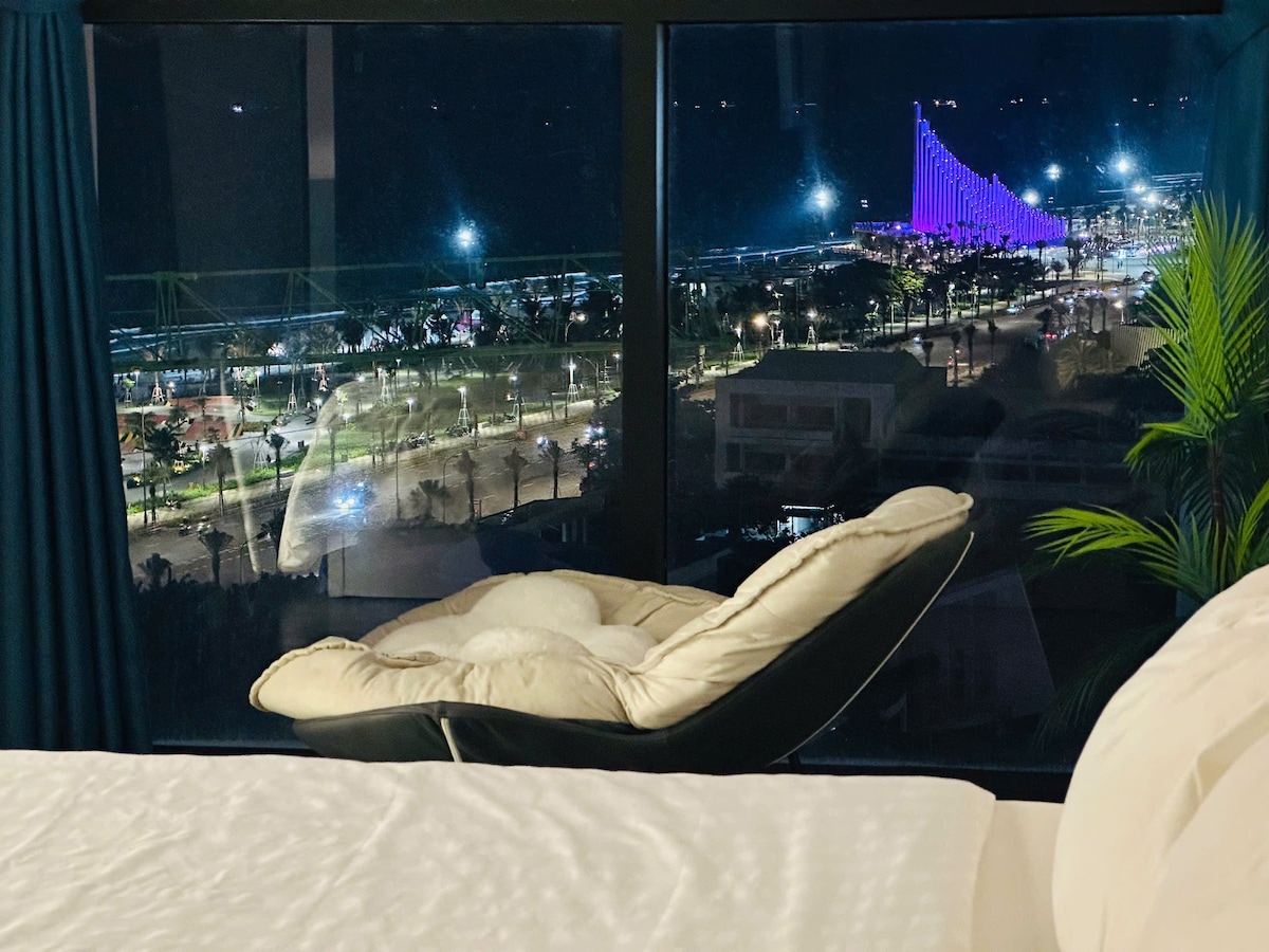 Minimalist, fully furnished 1BR apartment on the 15th floor with spectacular sea views. Ideal for couples or families with one child under 5. Perfectly located beside the Back beach (Thuỳ Vân beach). Estimated walking times to nearby amenities: - 2 minutes to reach the beach across the street - 5 minutes to the nearest 24/7 convenience store (GS25) - 8 minutes to the nearest supermarket (Lotte Mart) Fast elevators. Free Netflix. We also have one motorbike available for rent.