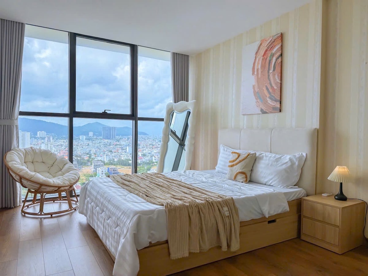 Căn hộ với thiết kế tiện nghi, rộng rãi không gian yên bình, ban công rộng rãi với khung cảnh lãng mạng để bạn có thể thư giãn cùng người yêu, gia đình , bạn bè. Căn hộ được tạo nên bởi sự ấm cúng với không gian phòng khách riêng biệt có tivi kết nối với Youtobe, Netfix, phòng bếp và phòng ngủ riêng biệt. Vào những ngày bạn cần thư giãn có thể lên hồ bơi tầng thượng để bơi lội thoả thích và ngắm trọn vẹn khung cảnh biển trong tầm mắt.