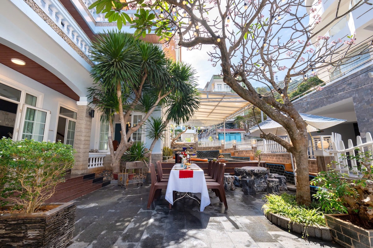 Villa có 7 phòng ngủ 11 giường và 6 nệm phụ, 8 wc. **Villa full tiện ích: _01 phòng karaoke ti vi smart 55 inch _01 phòng xông hơi, _bàn bia lỗ. Địa chỉ số 5b Lê Hồng Phong nối dài khu bthu Kim Minh, cạnh Pullman, cách biển 200m. _ Villa chạy full máy lạnh nhé. _ Còn xoong nồi chén bát lò vi sóng lò nướng, bbq ngoài sân, 3 bàn innox và 30 ghế ngoài sân... _phù hợp cho đoàn từ 15 tới 30 người _xung quanh có nhiều địa điểm ăn uống và vui chơi có thể đi bộ rất tiện lợi