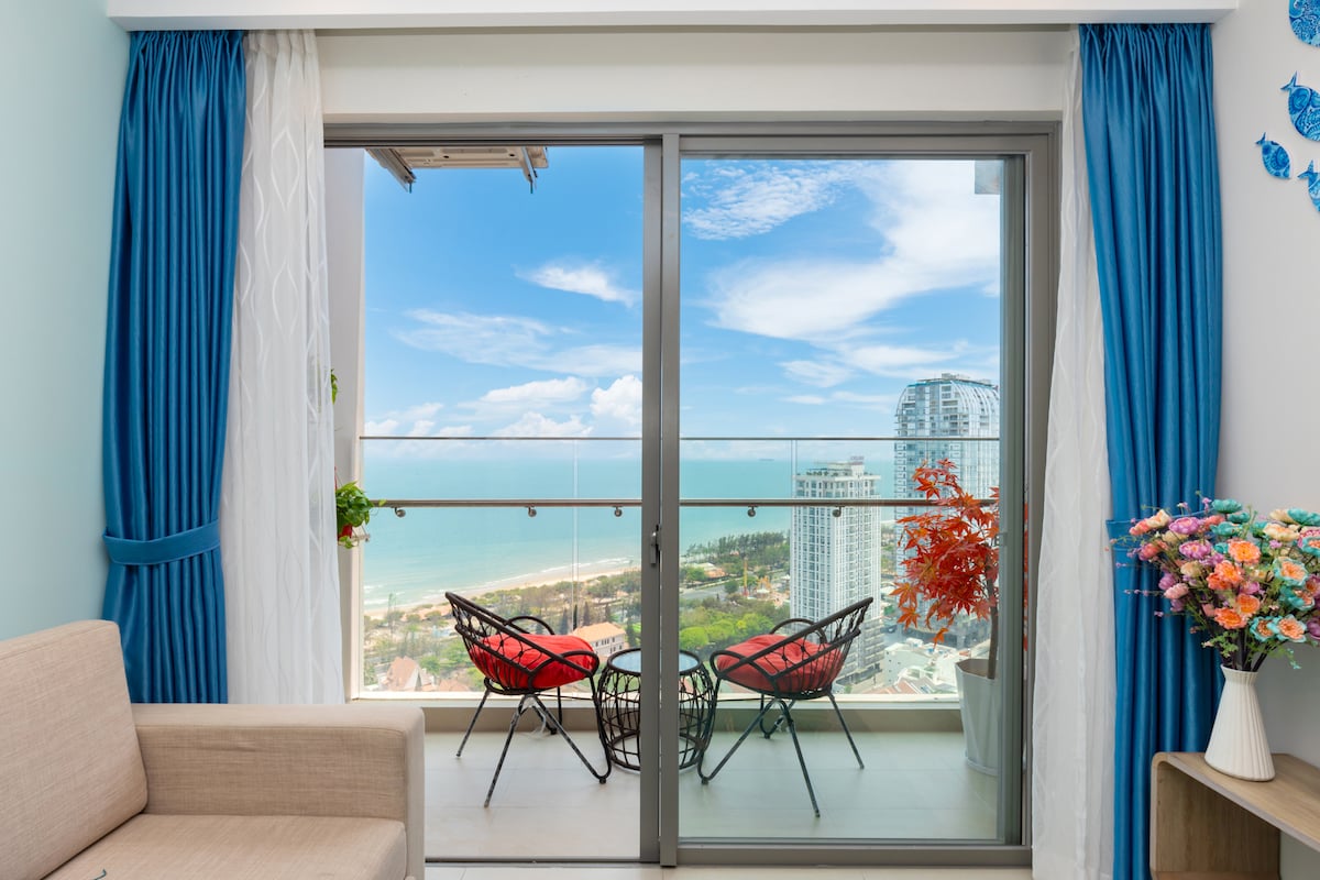 Minimalist, fully furnished 1BR apartment on the 15th floor with spectacular sea views. Ideal for couples or families with one child under 5. Perfectly located beside the Back beach (Thuỳ Vân beach). Estimated walking times to nearby amenities: - 2 minutes to reach the beach across the street - 5 minutes to the nearest 24/7 convenience store (GS25) - 8 minutes to the nearest supermarket (Lotte Mart) Fast elevators. Free Netflix. We also have one motorbike available for rent.