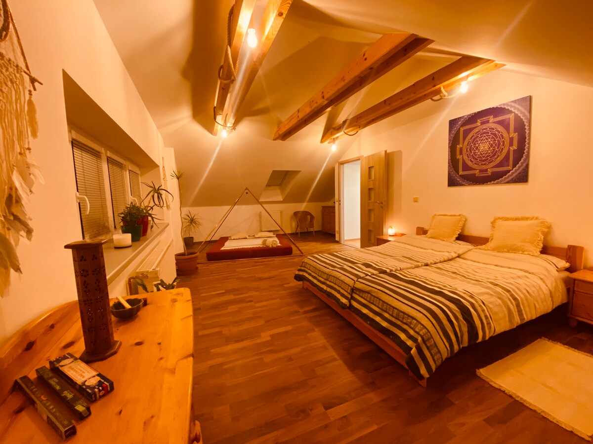 Výjimečná relaxace v privátní pyramidě a sauně. Pokoj je pro 2 až 4 hosty. Pyramida z mědi s parametry Velké pyramidy poskytuje nevšední zážitek. Očistěte své tělo, mysl i ducha v infrasauně a pak relaxujte v pyramidě 15-20 minut nebo v ní přespěte. Pyramidální energie pomůže uklidnit, navodit relaxaci, a umožní Vám propustit myšlenky na všední starosti. Může to ale být i náročné. Nevhodné pro děti. Ke snídani nabízíme ManaDrink, který pomůže odlehčit Vašemu tělu. Ubytování považováno za tiché.