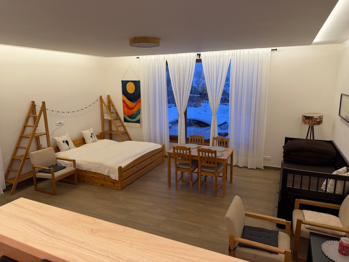 Dej si nohy na stůl a odpočiň si v tomto klidném, stylovém ubytování. Apartmán ti nabídne plně vybavenou kuchyň, pohodlnou a prostornou postel. Pár minut od ubytování se dostaneš do přírody a zároveň to není daleko od centra města.