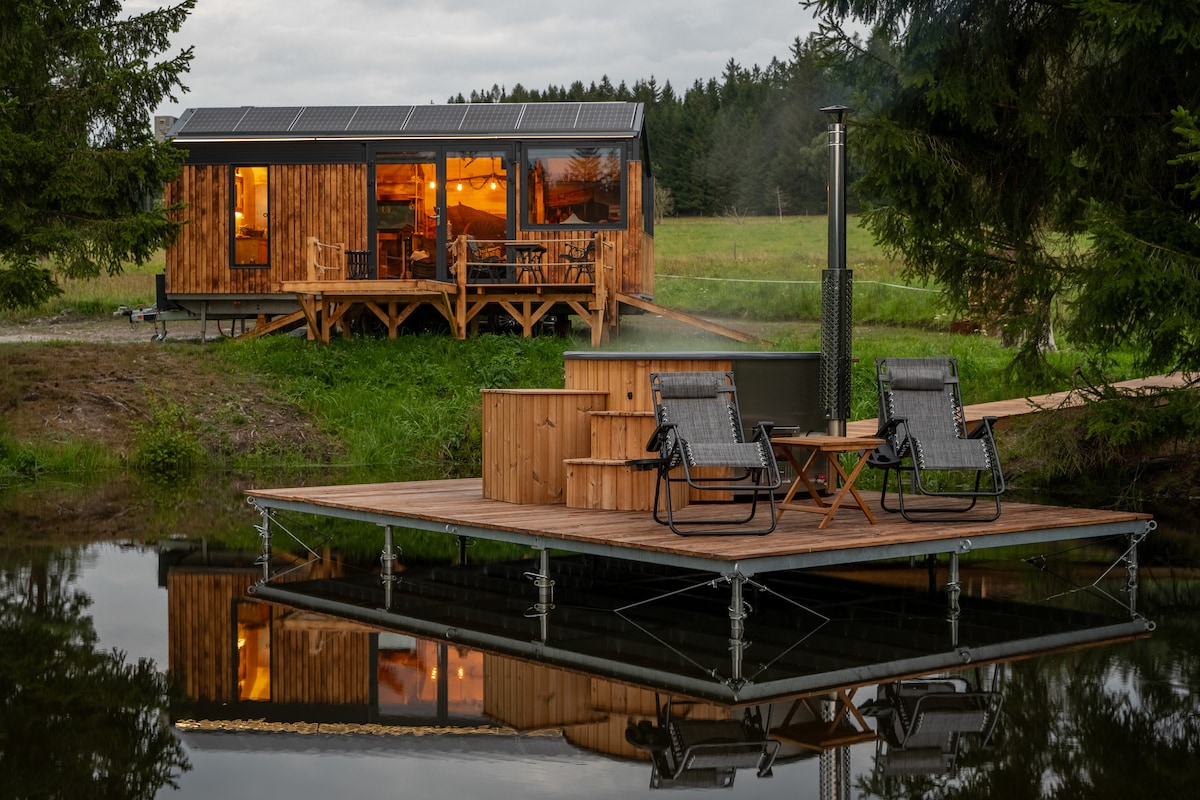 Zažij svobodu divokého západu! Tiny House Wild West stojí přímo nad rybníkem uprostřed pastvin, kde se krávy volně toulají a klid ruší jen praskání ohně. Uvolni se v horkém sudu s masážním systémem, vykoupej se v rybníku nebo si zkus chytit vlastní rybu. Opálené dřevo, vůně přírody a naprosté soukromí – tady jsi jen ty, příroda a svoboda. A kdyby ti jeden rybníček byl málo. 100 metrů na jihozápad najdeš další rybníček uprostřed divočiny.