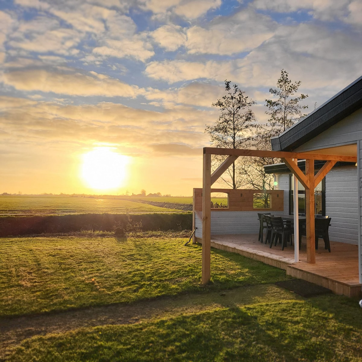 For those who enjoy being surrounded by nature, this peaceful chalet is the ideal place to relax. The chalet is very private and set in an orchard of just over a third of a hectare. (A pûnsmiet is an old Friesian word for a third of a hectare). It is a perfect place for those who want to indulge their creativity in writing or drawing. The beautiful views towards the dyke and into the orchard are unique in this Friesian landscape, where the sunsets are spectacular and ever changing.