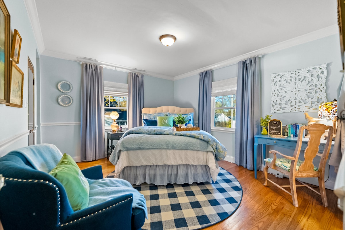 Inspired by classic English china, The Wedgewood Suite Paris soft blue tones with a touch of chartreuse for modern charm. Wedgewood china displayed on the walls pays tribute to timeless craftsmanship, while lofty linens are tailored to reflect a light & airy feel. These thoughtful details create an atmosphere of calm & refinement. The suite: A blend of classic charm with a refreshing modern touch. The suite includes ensuite bath, sitting chair for reading & relaxing, & small desk area.