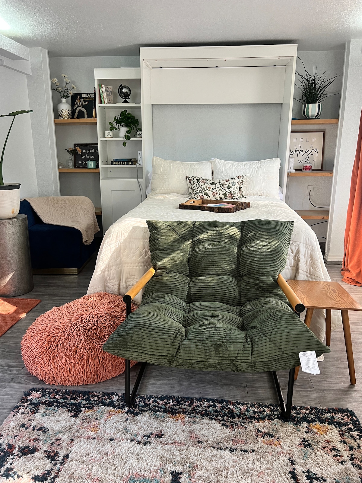With the attractive Dutch architectural lines and Santa Fe-style stucco exterior, wood trimmed interior, 10’ ceilings and custom made furniture, you’ll hardly believe you’re in a tiny house. One master bedroom with a king-size bed, a queen size sleeper sofa and a comfortable floor mattress allows up to six guests to sleep here. Full-size bathtub and luxurious walk-in shower, along with a kitchenette, dining room and more make this your perfect “home away from home.”