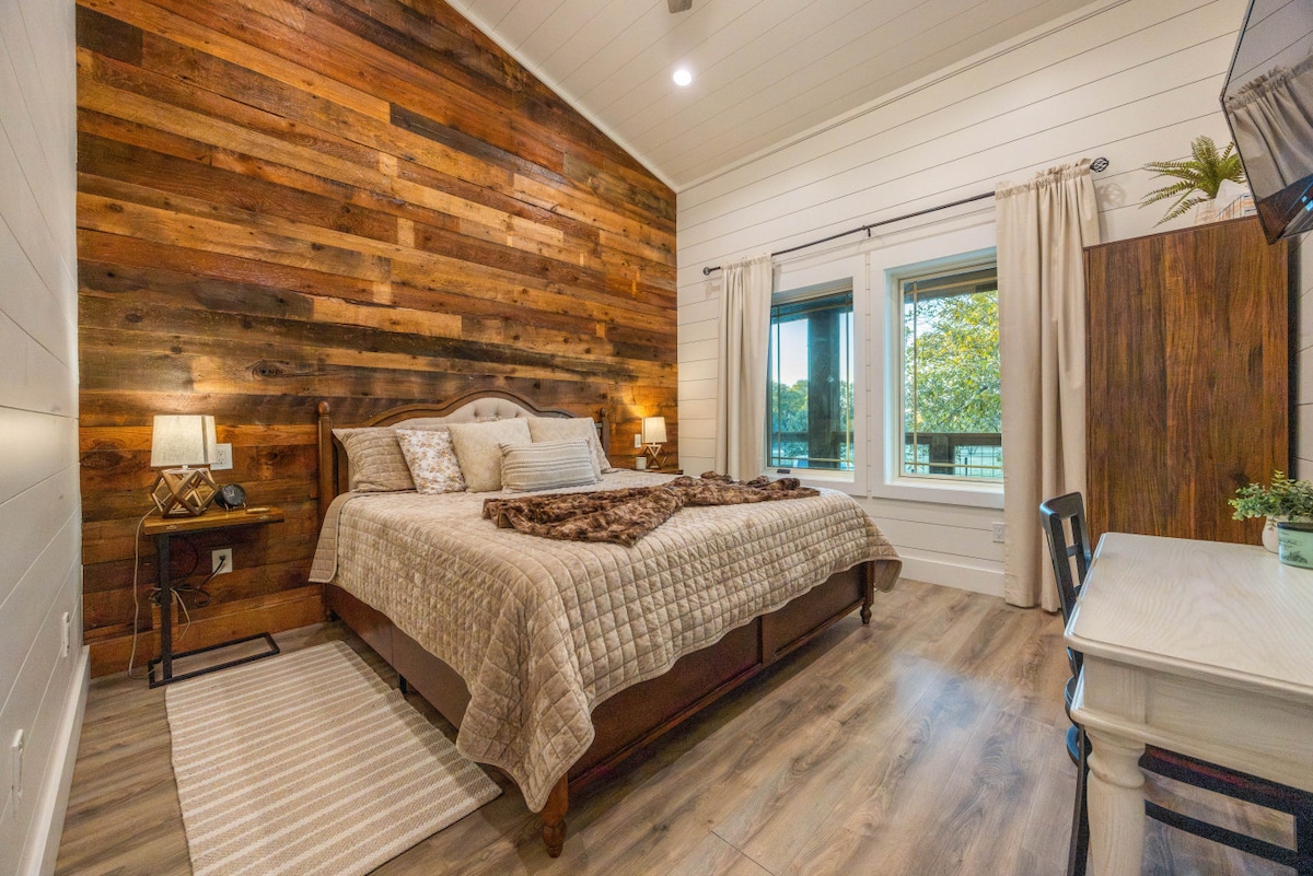 Tucked under magnificent Live Oaks at the water’s edge, Shadow Bend is the perfect getaway. Nestled carefully in nature, this modern cabin lacks no comfort or convenience; it even has a private hot tub outside! It has one queen bed upstairs and one full bed and bathroom downstairs. Complete with a micro chef’s kitchen featuring luxury appliances, top-notch mid-century furnishings and fine Scandinavian-inspired finishes throughout, this 600 sq. ft. cabin offers a one-of-a-kind experience.