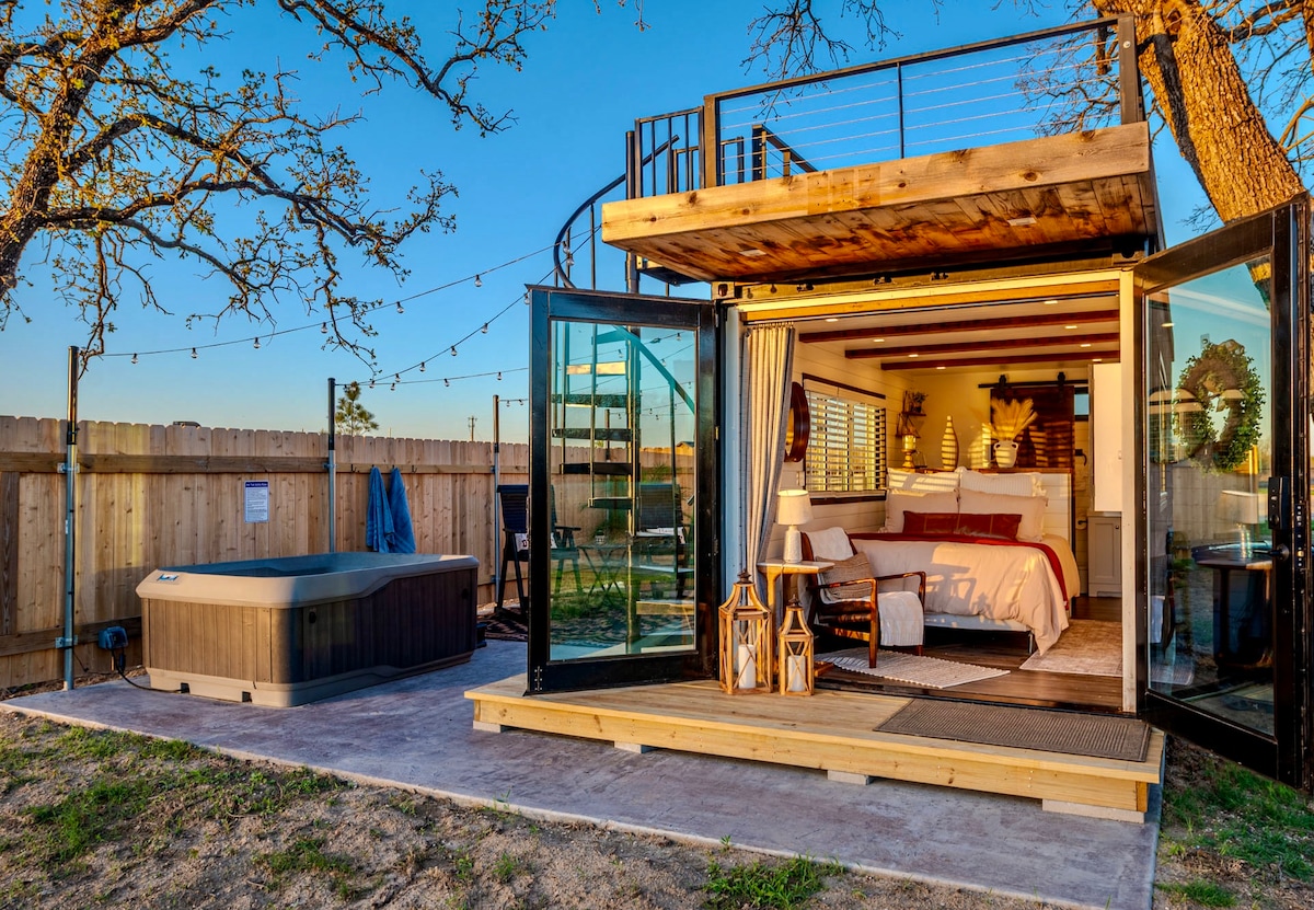 Welcome to Bluebonnet Trail! Come rest quietly in nature and enjoy all the amenities of an upscale hotel room and our unique design. Black Oak hosts a cozy queen size bed, a convenient kitchenette, and an elegant full bathroom with a soothing walk-in shower. Head upstairs to the rooftop deck to relax while stargazing or savoring your morning coffee, before heading out to play yard games and explore our walking trail. 12 minutes or less to Baylor, Magnolia Silos, Cameron Park and downtown Waco