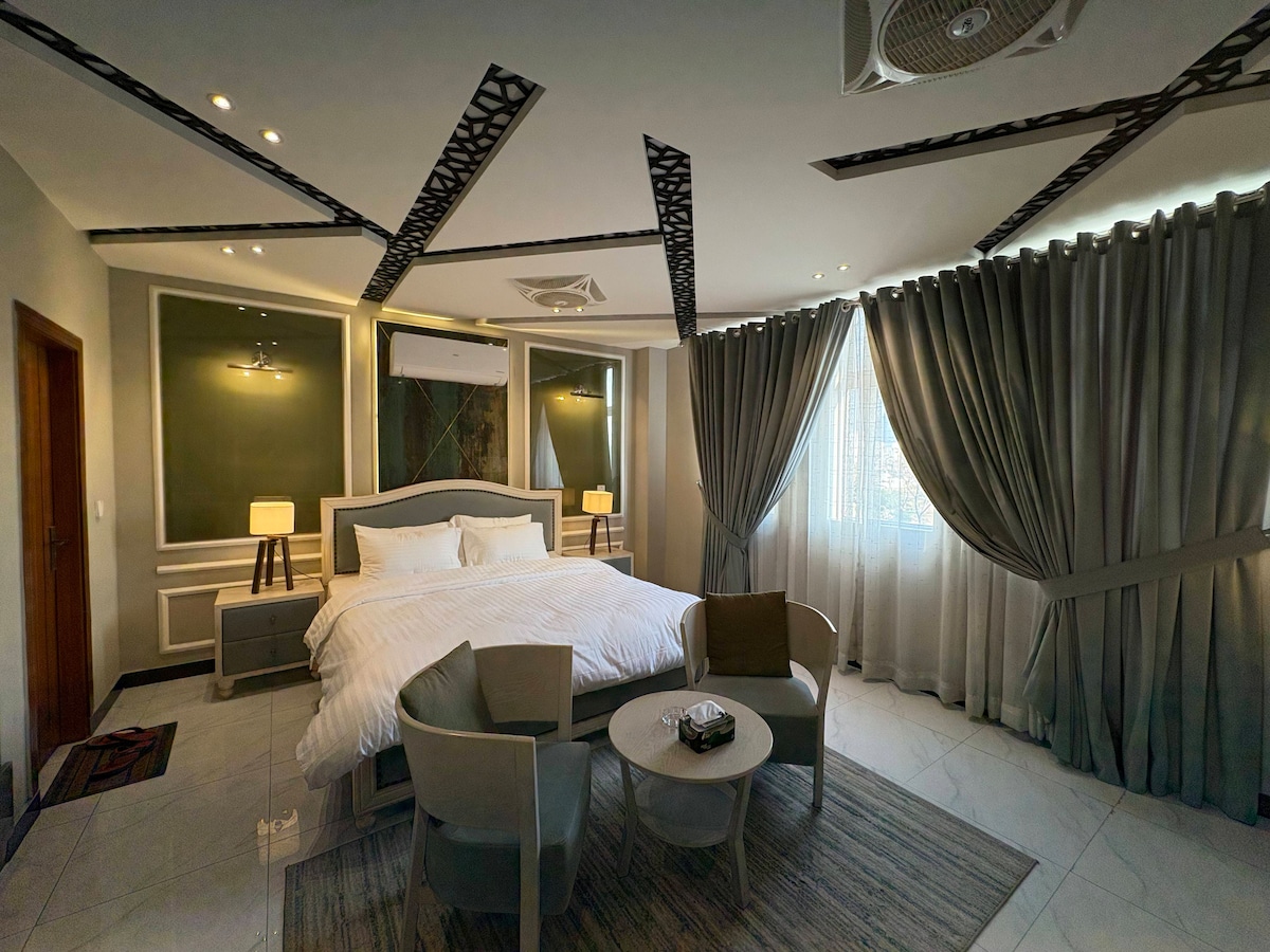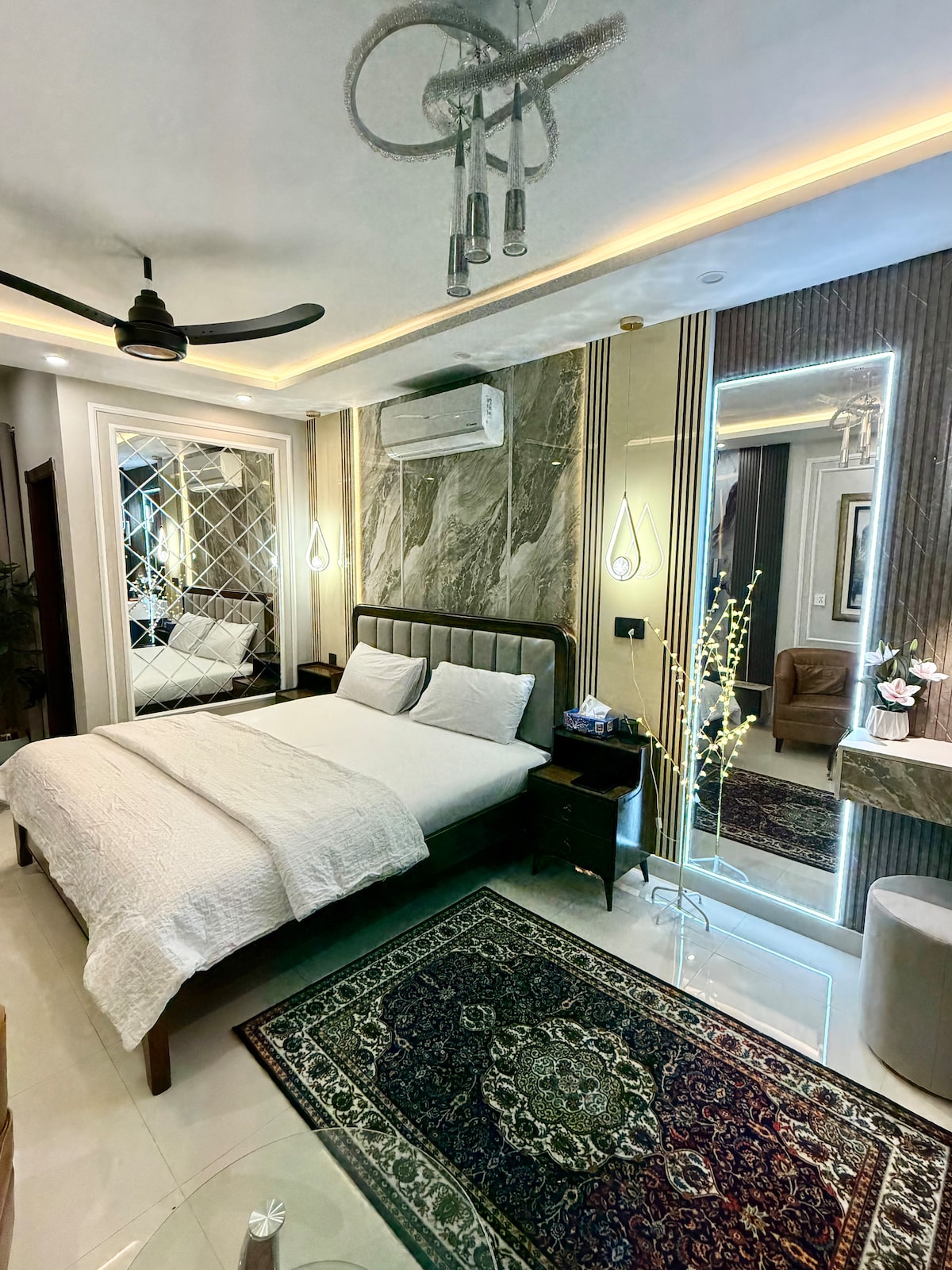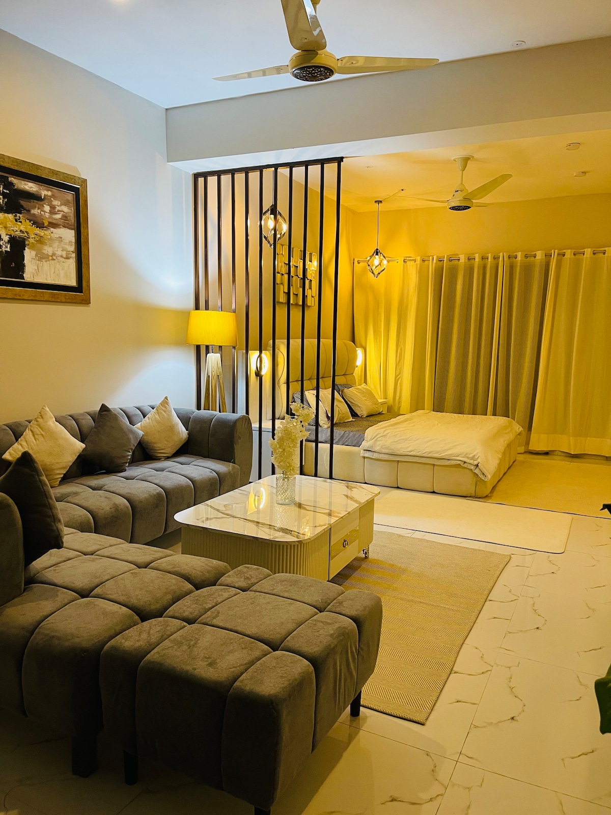 A stylish designer suite located on the 4th floor in the heart of Islamabad, just steps from F-11 Markaz. Bright, airy, and thoughtfully furnished, the space offers a perfect blend of comfort and elegance. Ideal for travellers with a cozy bedroom, modern kitchenette, and secure surroundings. Enjoy easy access to top cafes, restaurants, and shops, all within walking distance. Note: “Strictly only for families, unmarried couples/parties are not allowed” One vehicle parking is allowed