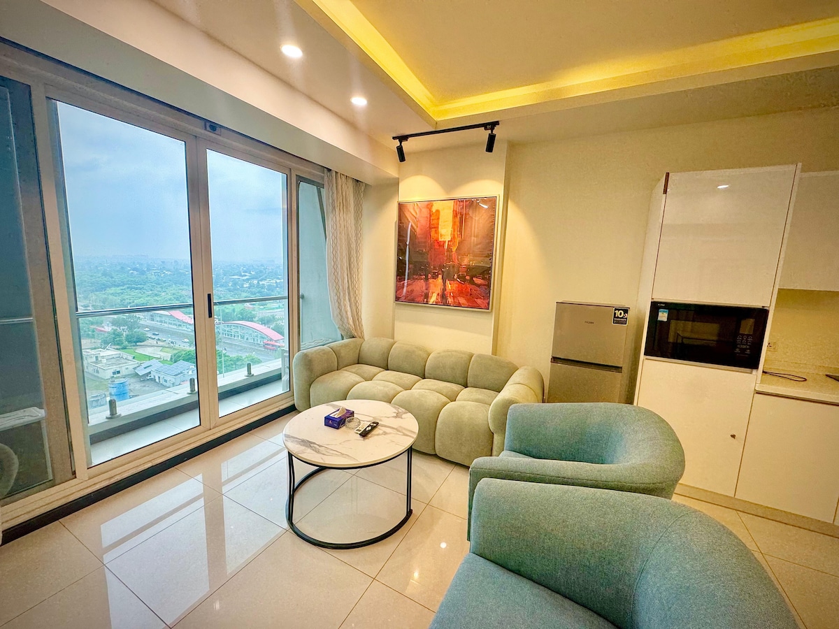 Discover the perfect blend of style and comfort in this compact, purpose-built apartment. Featuring designer-class interiors, it includes a cozy living area, a fully equipped kitchenette, and a plush king-sized bed. Located on the ground floor with private access, it offers a serene retreat for solo travelers and couples. Enjoy added privacy with a smart keypad lock and the assurance of uninterrupted energy back-up.