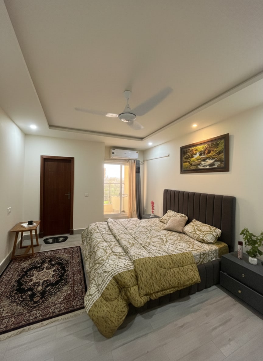 🏡 Welcome to THE FOUR - 3 Bed Room Family Apartment 🛏️ Plush beds & spacious rooms 🛋️ Relaxing lounge & modern kitchen 🚿 Clean modern bathrooms 🔐 Smart lock Self Check-in 📶 High-speed WiFi 🧃 Complimentary mini bar 🚿 24/7 Hot water Located in a secure, gated community, just 10 minutes from all major spots in Islamabad. This fully furnished apartment is perfect for families looking for comfort and convenience in Isb. A photo ID/CNIC of guest will be requested after confirmation.