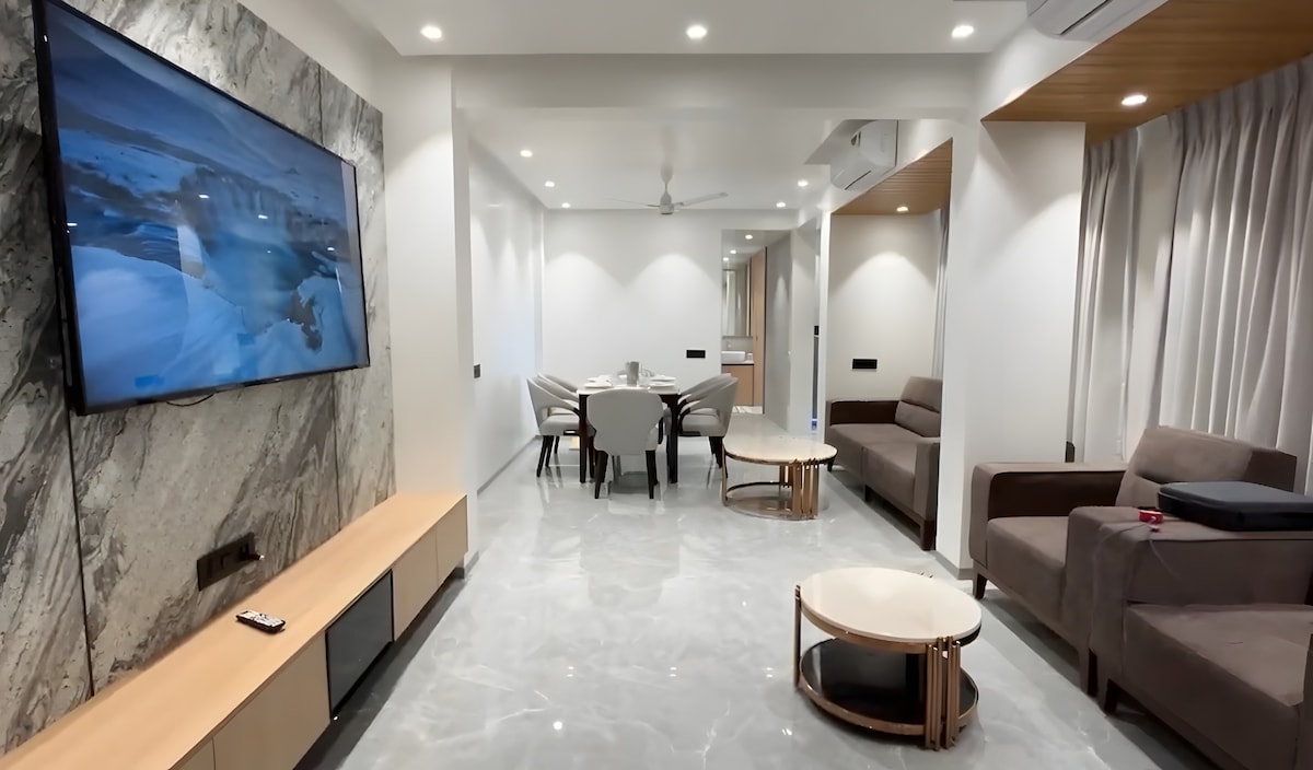Experience your perfect getaway at our luxurious 3BHK homestay in Sangamnagar, Satara. Located in the posh Sinhagad, Adarsha Vishwa CHS— just 7.5 km from Satara Railway Station— this premium stay is ideal for families, couples, and business travellers. Enjoy spacious bedrooms with scenic balconies, a cozy living room, modular kitchen and serene countryside views. With airy interiors and secure parking, it’s where comfort meets elegance.