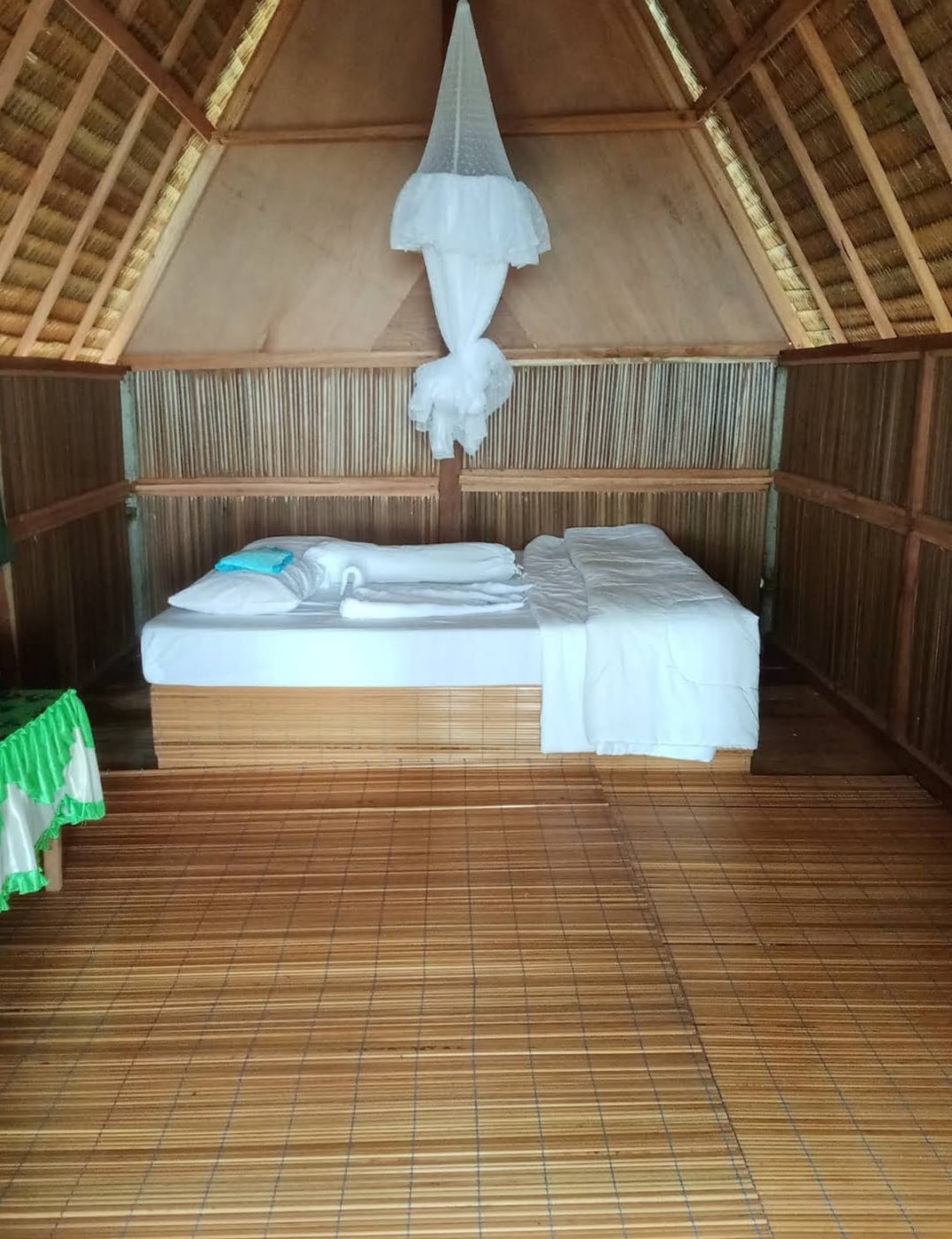 Tanjung Mefiyai Homestay has eight bungalows. There are three VIP bungalows on the beach and three more VIP bungalows on land. There are also two private bungalows (without en-suite bathrooms or toilets). All rooms have light switches and power outlets for charging equipment, glass windows, and all doors can be locked. The bedrooms can accommodate two people on raised beds. Sheets, pillows, bolsters, and mosquito nets are provided. An extra mattress can be provided.