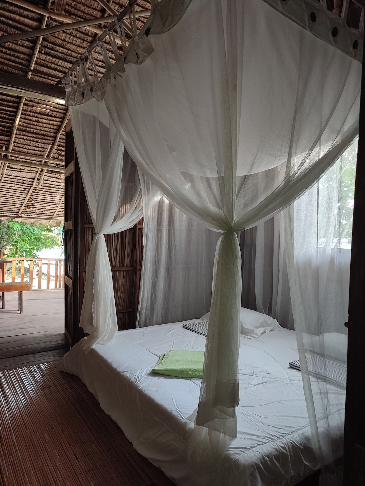 Between the mangroves, Methos owns a strip of beach, on which three ‘Water Bungalows’ are located. Each bungalow accommodate two people and is built on stilts in the water. The bungalows are fully equipped with furniture, has a large veranda with sundeck. The bed is completely covered by a king-size mosquito net. On the veranda there is a hammock and a sun-lounger, from where you can watch the sunset.