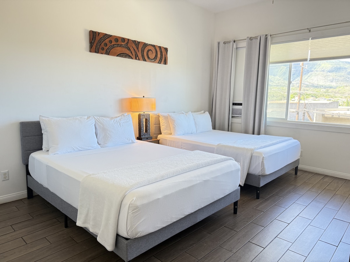 Enjoy a cozy stay at this 324 sq ft modern Ohana studio apartment in Maui, featuring a small kitchenette and private bathroom. Large windows offer beautiful views of the West Maui Volcano and the warm Hawaiian breeze. With amenities such as A/C, Wi-Fi, smart TV, and free parking, it's centrally located where the west and east sides of Maui meet, providing easy access to stunning beaches and the airport within a 10-15 minute drive.