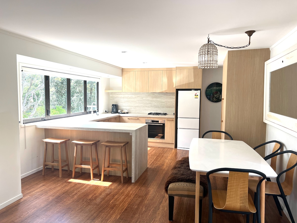 Escape the city with this stylish kiwi cottage. The house has 2 double bedrooms, 3rd double bedroom in a sleep out adjoining the house. A 4th bedroom is a small single for kids. A modern kitchen gives the option to cook. This sun drenched house has decks on both sides, private north facing outdoor living at the back with a front deck flowing from the lounge with great sea views. Only 100m from a bus stop so easy to get to and from the ferry and walking distance to shops, cafes, and beaches.