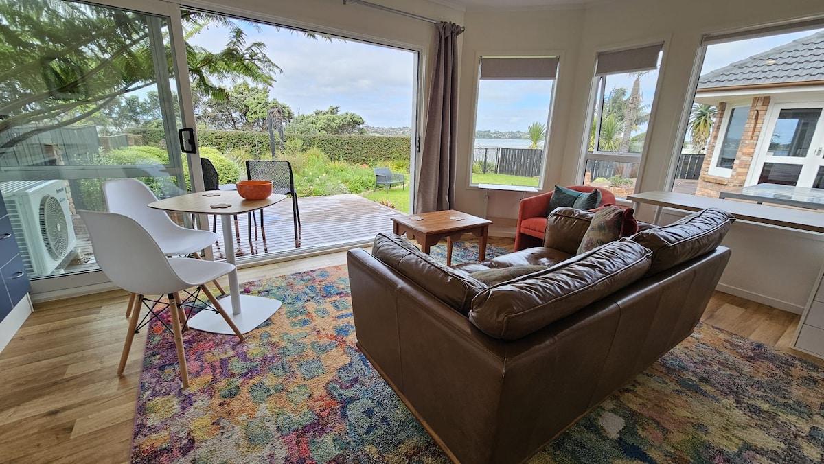 Retro' beachy spacious studio unit, private entrance and expansive ocean views to Waiheke to the sand across the road. 40 minutes to airport, 35 minutes Pine Harbour ferry service to Auckland city nearby. Cafe next door, takeaways, Indian restaurant a short walk. Beautiful walks, reserves, regional parks Omana and Duder and mountain biking park nearby. Safe swimming beach for stand up paddle boarding, kayaking, fishing from the wharf. Jet skies for rent next door. It's truly a little paradise