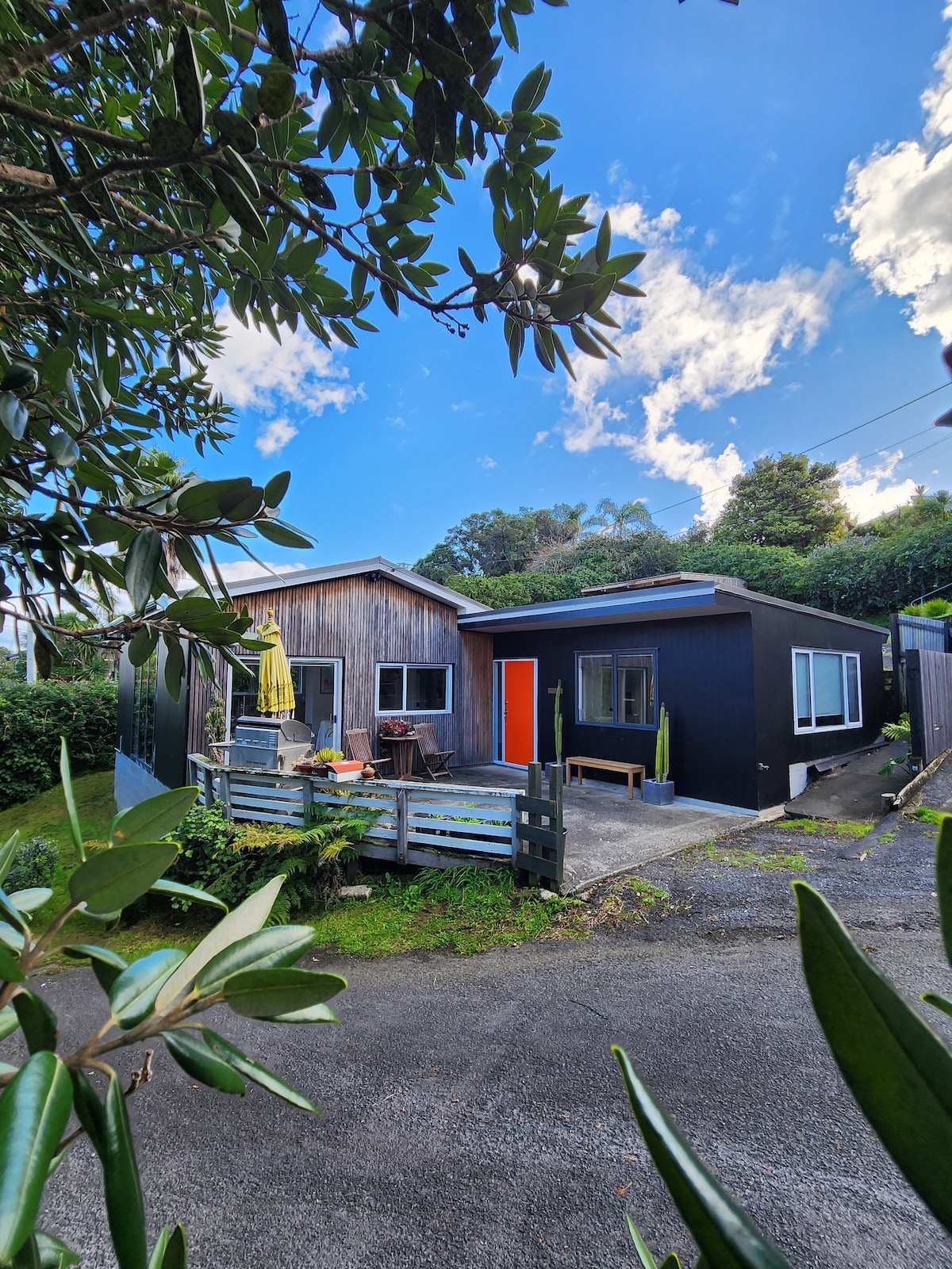Experience the true Waiheke way, surrounded by birdlife and treetops and only 700m walk away from Palm Beach . Your Airbnb gets great afternoon sun to enjoy a wine or BBQ on the deck. This spacious retreat has everything you need: Living area with sofa bed for extra guests or family, a kitchen with all essentials, your own private bedroom looking into nature and a bathroom with washing machine. Discover our guest house, a tranquil hideaway nestled among treetops.