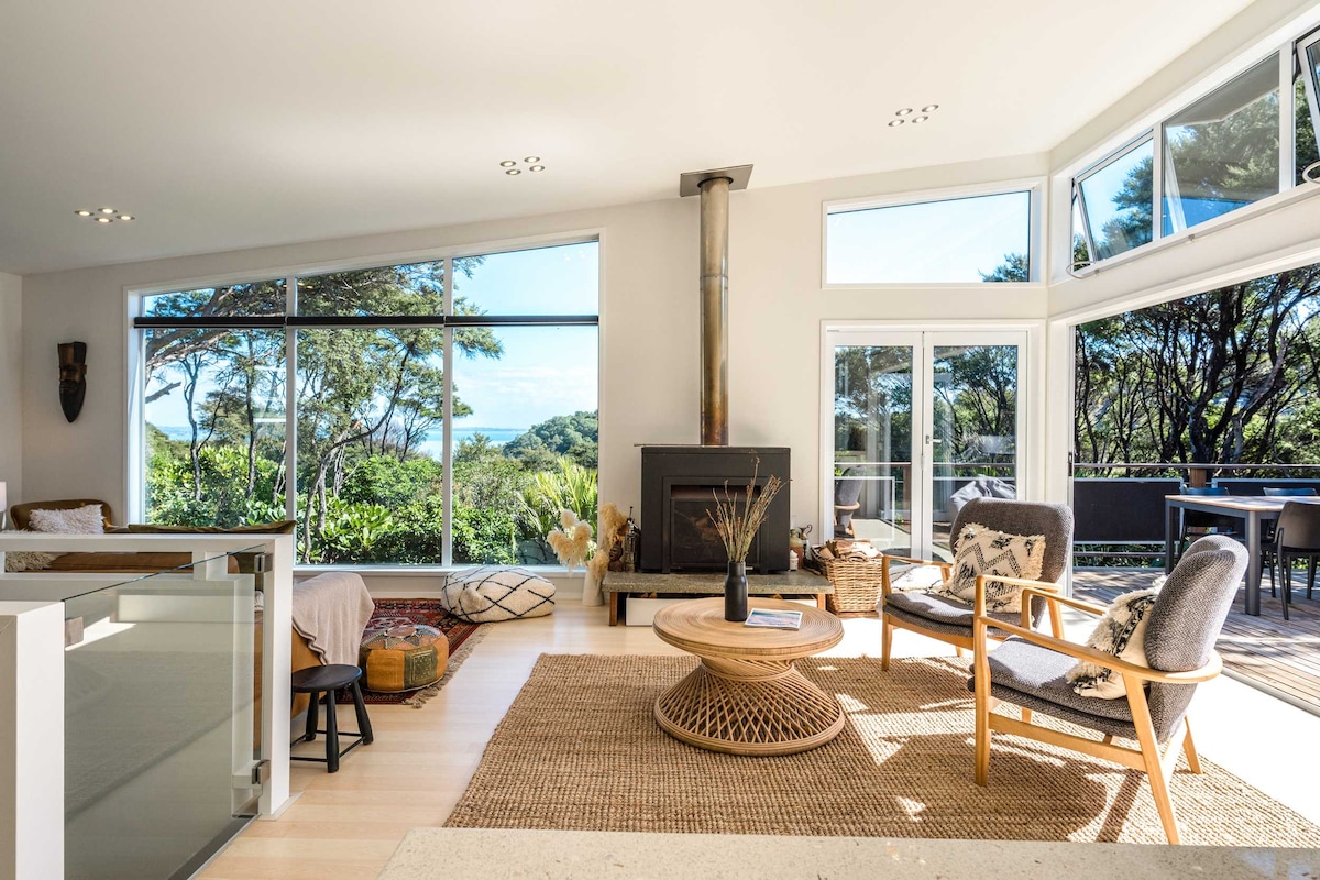 Nestled in peaceful Rocky Bay, this stylish, architecturally designed home offers stunning sea and bush views, perfect for a relaxing Waiheke Island escape. The open-plan living area features a modern kitchen with European appliances, a cozy wood fire, and bi-fold doors that open to a spacious deck—ideal for entertaining or unwinding while enjoying the surrounding natural beauty.