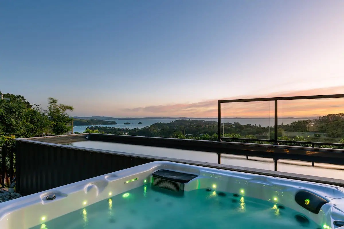 Enjoy luxury on Waiheke Island in a spacious and stylishly furnished home. Huge sun-drenched decks, 360 degree expansive views, pool/hot tub, two lounges with Samsung smart tvs and second kitchenette. Central location to access all the best that Waiheke has to offer. Heating in all bedrooms and fire makes it a great winter escape. Yoga available Amazing walking track in front of house, under 20 mins to Palm Beach