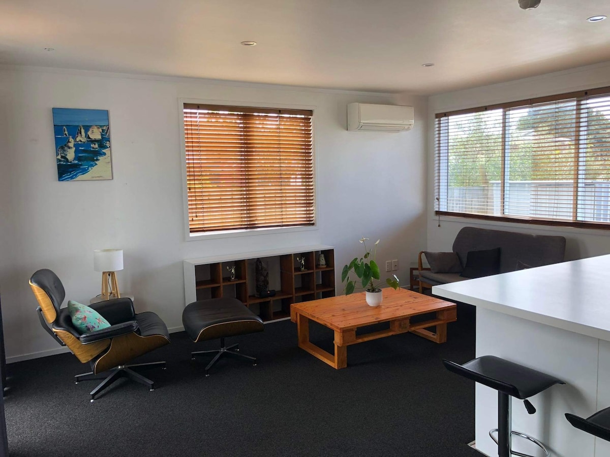 Bright sunny, warm rooms, located downstairs in our family home. It has a lounge with a Queen sofa bed, dining room table, full size fridge/freezer, your own private bathroom and a separate queen bedroom with kitchenette. There is a separate entranceway with off street parking. Located close to two family safe beaches and Howick Village. There are plenty of options for cafes, shopping and walking tracks. We are happy to share our wonderful environment.