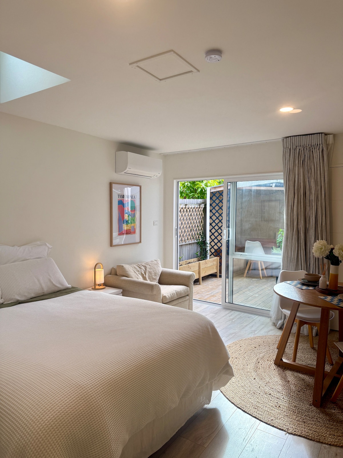 A gorgeously stylish & newly renovated studio where proximity to two beaches is key! Walk to the bottom of the drive & you're literally seconds away from the stunning Enclosure Bay. Turn right & you're an easy 3-minute stroll to an equally picturesque swimming beach, Sandy Bay. The studio is located a 7-minute drive to Oneroa Village, 10 minutes to the ferry & being a central location on the island, award-winning vineyards are a scenic drive in any direction. Location + Style + Breakfast!