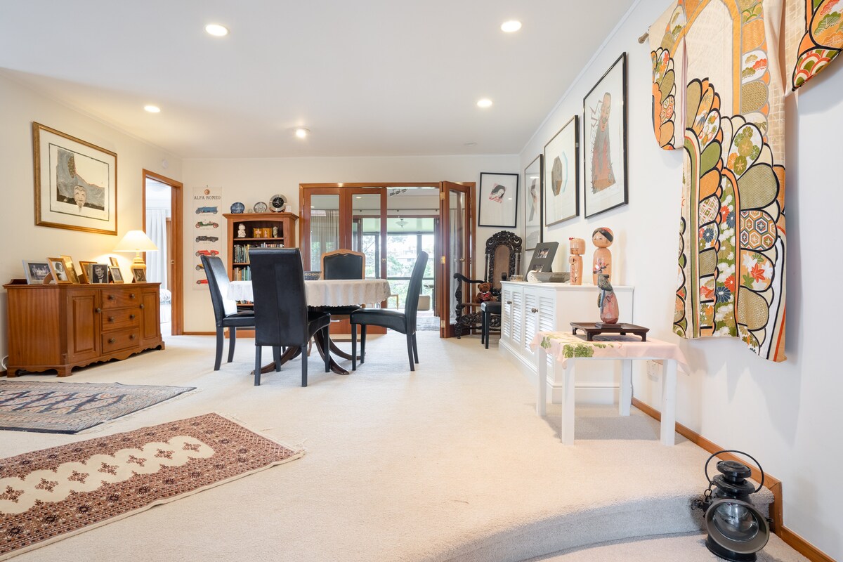 本套房与主人空间完全独立,是这套全新二层整体别墅的一部分,封闭庭院,安全幽静,友好社区。 别墅位于东区Pakuranga Heights,交通极其便利,Bus站就在门口,五分钟可上高速,二十分钟可到机场,十五分钟到市中心和奥克兰战争博物馆,七分种可到Half Moon Bay ,距离Lloyd Elsmore公园,仅三分钟的车程,在这里您可以享受阳光、草地、步道、游泳、健身房、鸭池和儿童 Playground,旁边即是Highland Park购物中心,有大型洋人超市和华人超市。距离最近的购物中心Pakuranga Plaza 仅有四分钟的车程 ,每周六下 午六点有夜市,距离 Botany Downs购物中心有八分钟的车程,距离 Sylvia Park购物中心十分钟的车程。 该套房共有二房一厅一卫,配有可简单煮食的小厨房,房间配有空调,HD电视,客人专用冰箱及免费光纤WIFI,路边有大量免费停车位。全新的床品,每批客人离开后都会清洗,保证客房干净整洁,我们还为客人备有牛奶,面包,麦片,咖啡,茶,水果做为入住前三天的早餐。洗衣房在房主一侧,需要时我们会开放。