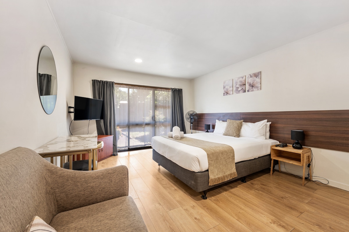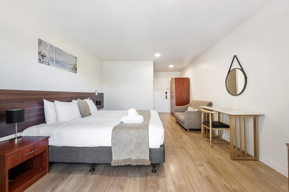 Studio Our Studios are the perfect choice for solo travelers or couples seeking comfort and convenience. Designed with a modern touch, these rooms offer everything you need for a relaxing stay. Features: Comfortable queen bed for a restful night’s sleep Private ensuite bathroom with quality amenities Kitchen with microwave, cooktop, fridge, and tea/coffee facilities Compact yet stylish, our studios provide a cozy retreat after a busy day exploring Hamilton or attending events at FMG Stadium.
