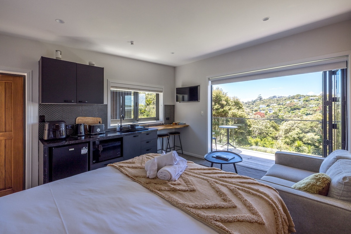 Unique Pod Living in the iconic Palm Beach with elevated valley views. The stylish pod provides comfortable living for up to 4 adults with two bedroom's featuring super king beds, open plan living and a large deck to soak up Waiheke's atmosphere. These pods are brand new with all the mod-cons and with a touch of luxury. We are located on a main bus route only 15mins from the ferry and within walking distance to the beautiful Palm Beach.