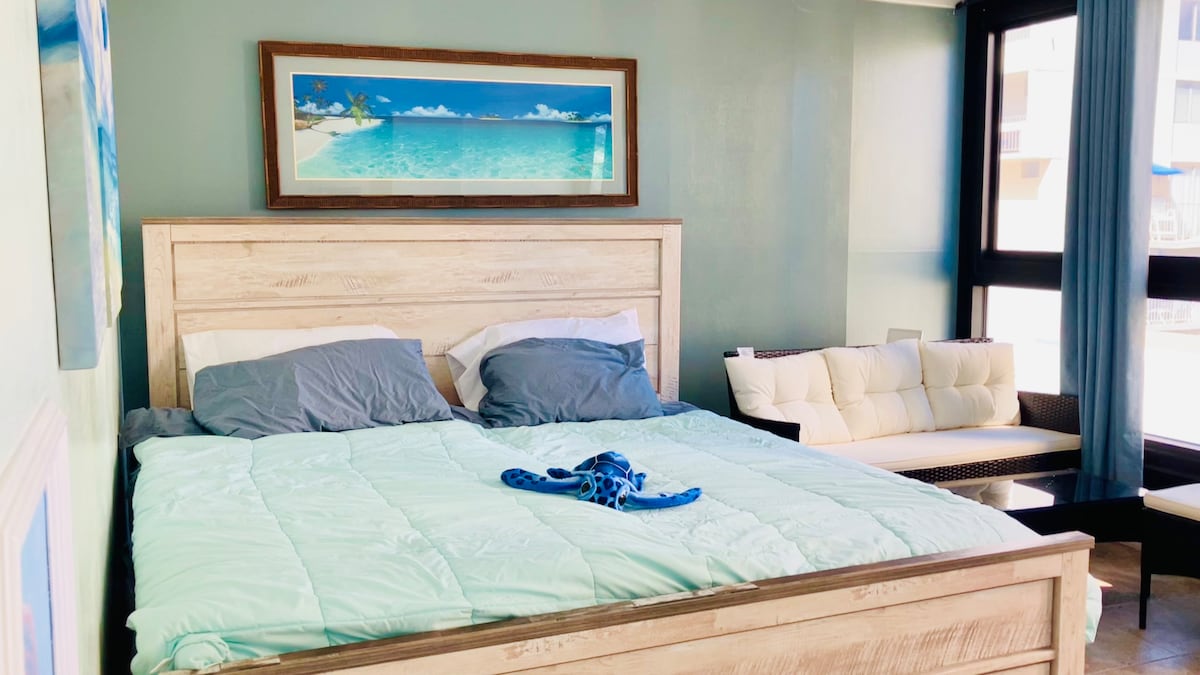 Whether you are planning a perfect romantic getaway or a much deserved quality family time vacay for FOUR, this high floor apartment w/ocean views checks all the boxes. The 1 bedroom with the KING BED is ideal for the parents, while the kids share the QUEEN SLEEPER SOFA in the living room. The kitchen is fully stocked w/everything you will need to prepare meals, drinks and snacks. It's a 4 minute walk to the beach. There is 1 FREE PARKING spot and there's NO RESORT FEES. Close to shops & food.