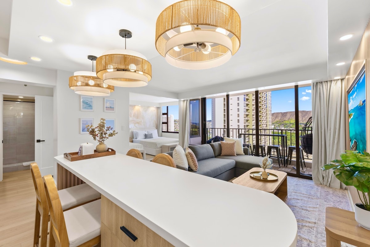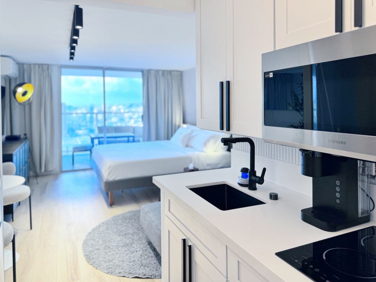NEW! Waikiki City View Studio. This newly renovated studio offers 382 sq. ft. of stylish living space with a spacious lanai, where you can enjoy breathtaking city&Koolau mountain views and enjoy your meal. Sleeping Arrangements: • King-size bed for ultimate comfort • Two twin-size Japanese-style futons Kitchenette Amenities: • Electric kettle with complimentary ground coffee and hibiscus tea • Portable induction stovetop for light cooking • Dinner plates, bowls, microwave, and wine cellar