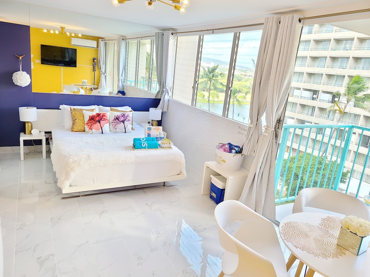 New! Beautiful condo in the center of Waikiki with Free Parking! Fully furnished studio with a queen bed, 50" Smart TV, dyson cordless vacuum, iron, iron board, kitchen supplies (rice cooker, egg maker, toaster, microwave, Induction cooktop, electric pot, coffee maker, etc.), individually wrapped spa set, shaving kits, compact sawing kits, and beach supplies (full face snorkeling masks, dive fins, boogie board, beach mat, beach umbrella, cooler)