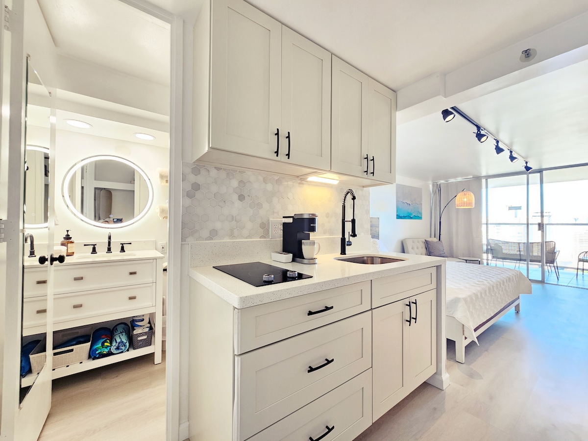 Stylish studio in the heart of Waikiki, with private lanai, spacious bedroom, fully equipped kitchenette, and premium access to Island Colony’s sun deck, pool, sauna, jet spa, BBQ, gym, and more!! Steps away from Kuhio Ave, with everything in walkable distance. Perfect for couple’s getaways, remote work, and family vacations! Under 7-minute walk to: ✔ Musubi & Bento IYASUME ✔ Marugame Udon ✔ Waikiki Beach ✔ Royal Hawaiian Center ✔ International Market Place