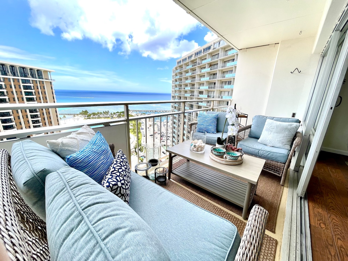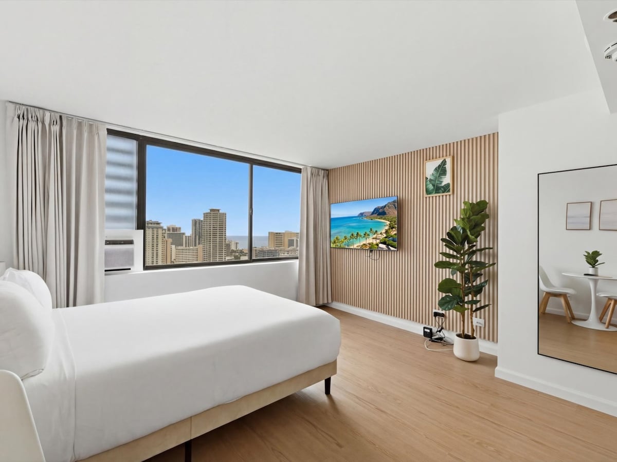 Fully renovated in 2021, this stylish one bedroom is brand new. The 27th-floor unit with a private balcony comes with amazing ocean views and is one block away from the world-famous Waikiki Beach! Included: High-speed free wifi, Smart TV, central AC, full kitchen with appliances, cookware, dishes, and utensils, laundry on each floor. There's an ergonomic standing desk for those who wish to work from home. We hope you have a fantastic stay!