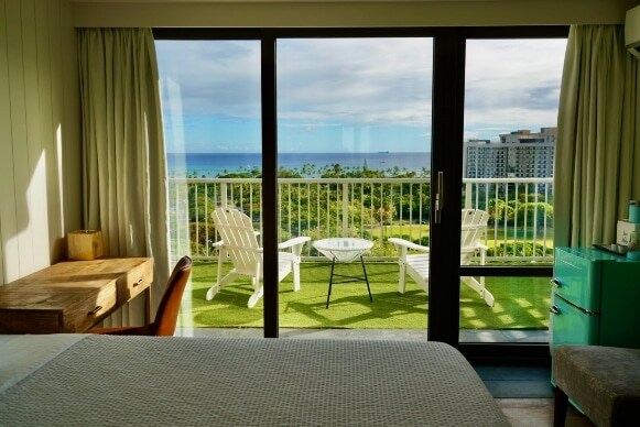 Our accommodation is a boutique-style studio located in the heart of Waikiki. The room offers a variety of views including the Ala Wai Canal, the Ala Wai golf course, mountain views, and even a partial ocean view. It provides a quiet and comfortable space for you to relax. You can easily explore Waikiki without a rental car, as major restaurants, cafés, and shopping centers are all within walking distance.