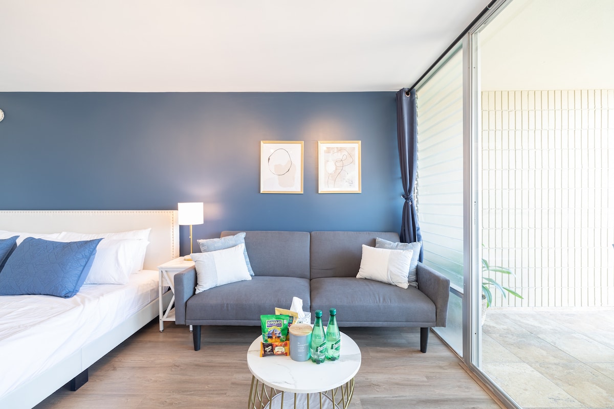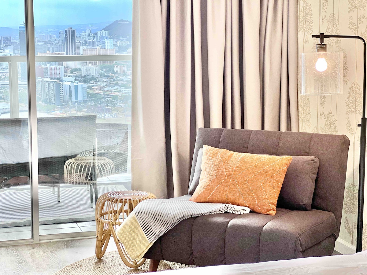 This spectacular, stunningly renovated studio suite is located on Seaside Ave in Central Waikiki! Relax on a large king size bed, 65in HD4K TV and enjoy quiet and comfort cooling with a new split AC system. Utilize the full kitchen for a home cooked meal and enjoy the fresh Hawaiian breeze on your own private balcony. Beautifully furnished with modern and luxurious finishes, this apartment is the perfect choice for couples and small traveling groups!