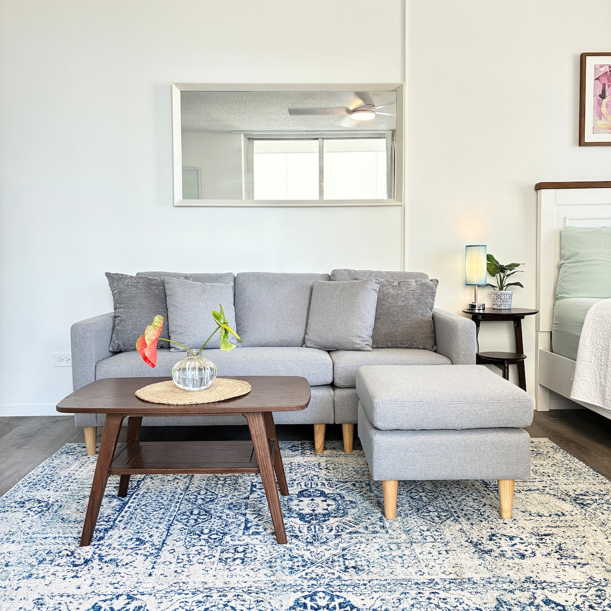 Newly renovated 1-bedroom with stunning panoramic ocean views! Enjoy an open concept layout with a king bed, full-size appliances, and a sofa bed in the living room. Features include central AC, fast WiFi, TVs in both rooms, and a large pocket door for privacy Step onto the Juliet balcony to take in the ocean view including the Friday night fireworks. Walk to Ala Moana Mall, Hilton Hotel, and Duke’s Lagoon plus more Garage parking available for $33 a night 24/7 security, laundry room in building