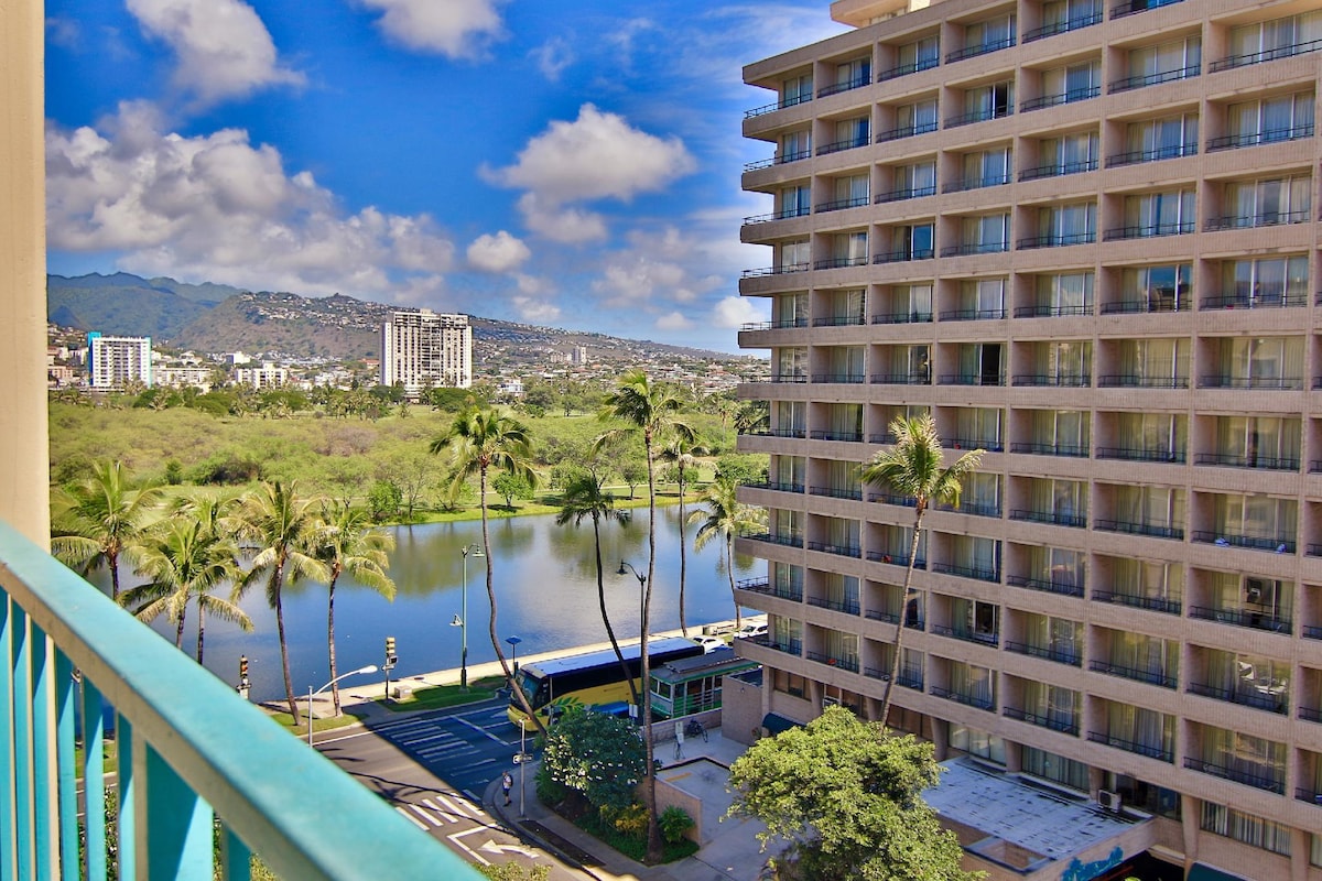 Our accommodation is a boutique-style studio located in the heart of Waikiki. The room offers a variety of views including the Ala Wai Canal, the Ala Wai golf course, mountain views, and even a partial ocean view. It provides a quiet and comfortable space for you to relax. You can easily explore Waikiki without a rental car, as major restaurants, cafés, and shopping centers are all within walking distance.