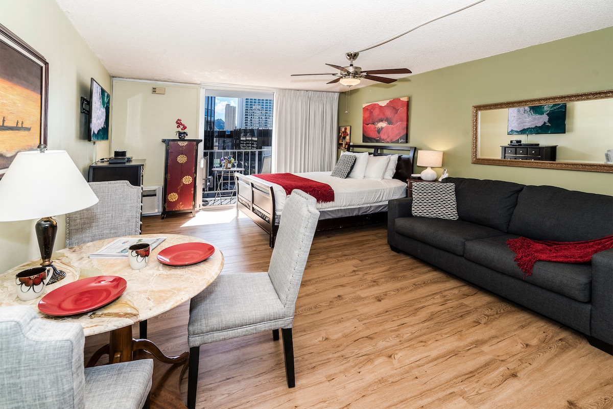 Book in the heart of Waikiki on a high floor with ocean views, a TWO MINUTE walk to the main beach & shops! Paradise is calling! Enjoy a cup of coffee while taking in the sweeping partial ocean, mountain, and city views. Our private and airy studio boasts a plush queen bed, firm twin sofa bed (recommended for a guest 5'9 or under), full bath & kitchenette. High-speed internet for streaming your favorite movies or catching up on remote work life. Reserve now before we're fully booked!