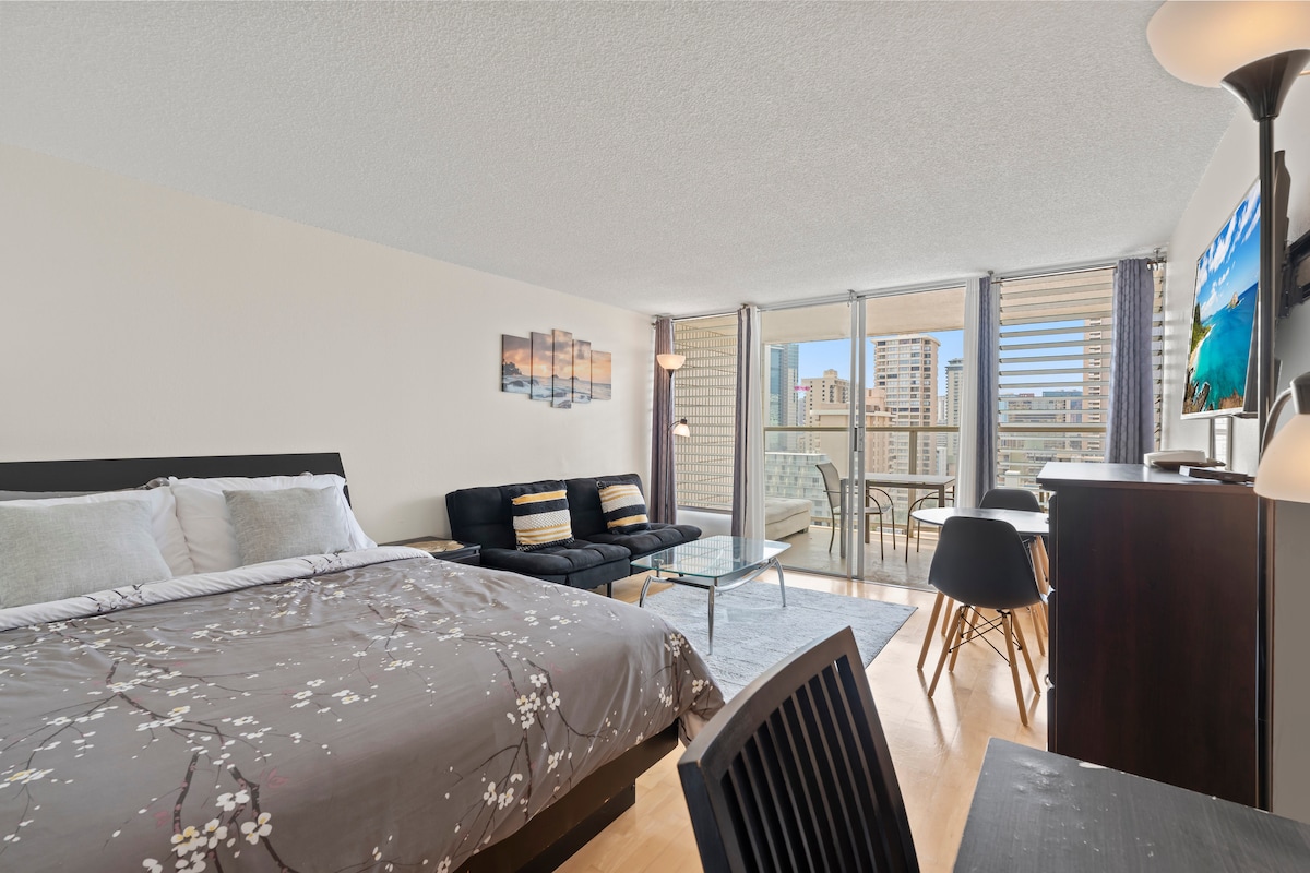 Beautiful & elegant 41st floor studio suite in the heart of Waikiki! Enjoy breathtaking sceneries of the Waikiki skyline and ocean views on the private, spacious balcony. Stunningly renovated with modern decor and fully stocked with everyday essentials. Enjoy a newly installed Split AC system, 65in HD4k TV and a large King size bed with a twin sofa sleeper. This studio is the perfect choice for couples and small families!