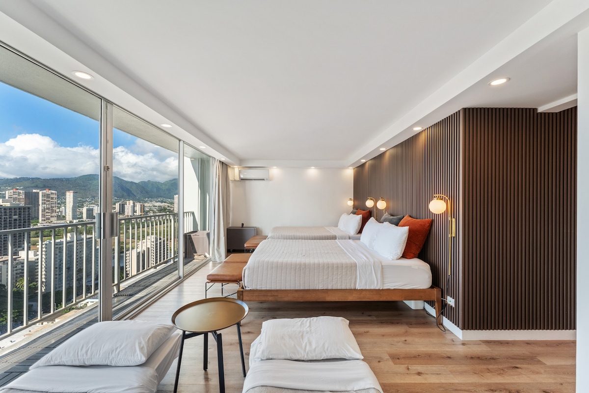 Book in the heart of Waikiki on a high floor with ocean views, a TWO MINUTE walk to the main beach & shops! Paradise is calling! Enjoy a cup of coffee while taking in the sweeping partial ocean, mountain, and city views. Our private and airy studio boasts a plush queen bed, firm twin sofa bed (recommended for a guest 5'9 or under), full bath & kitchenette. High-speed internet for streaming your favorite movies or catching up on remote work life. Reserve now before we're fully booked!