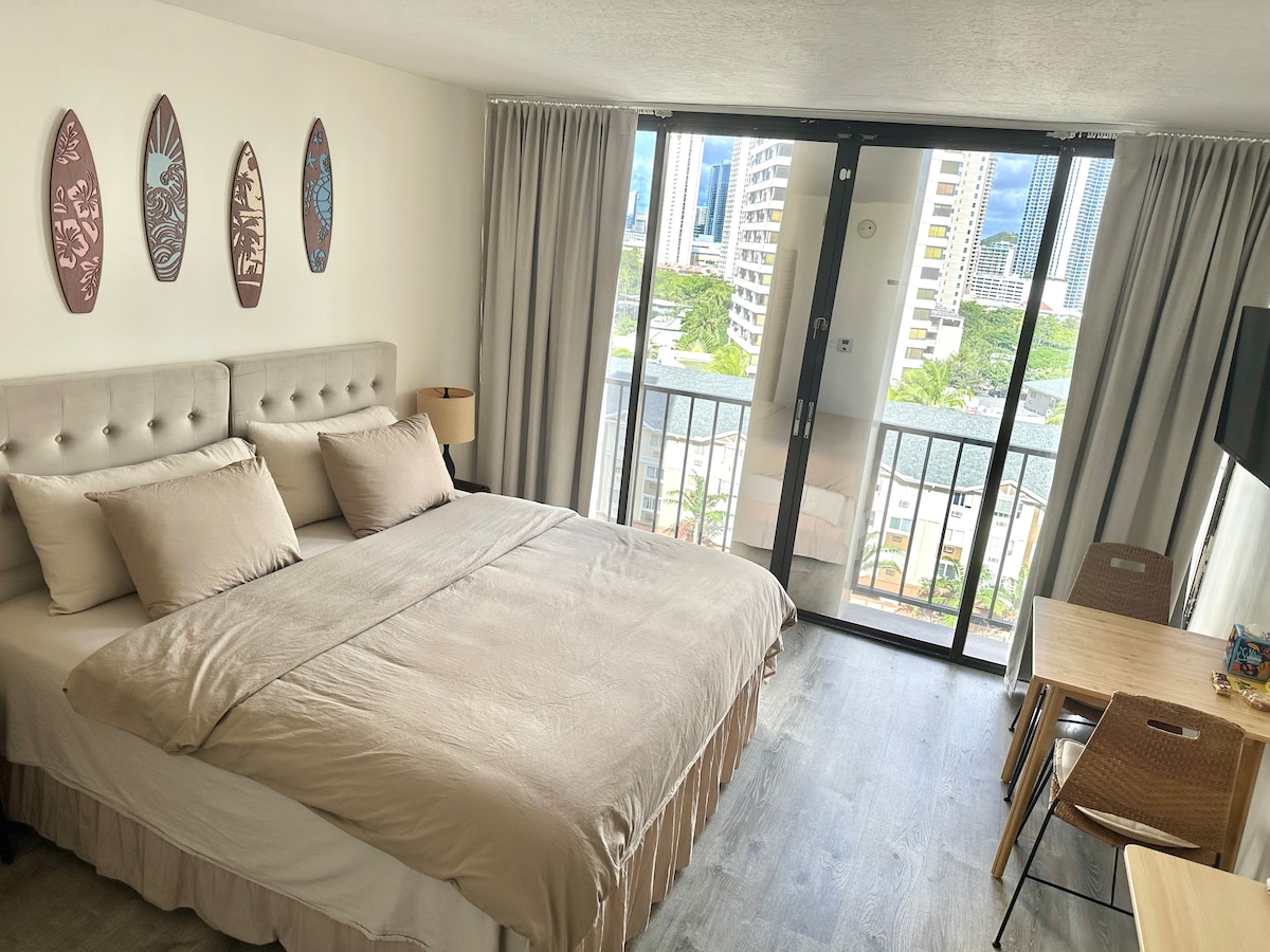 Private use of the entire studio unit in the building of Aqua Palms Waikiki Hotel. Our comfortable studio accommodates 2 adults, is located in the Fort DeRussy and Hilton lagoon area of beautiful Waikiki. Everything is within easy walking distance including the Ala moana beach park and Waikiki beach, Convention Center & Ala Moana shopping district, restaurants and entertainment. King size bed.