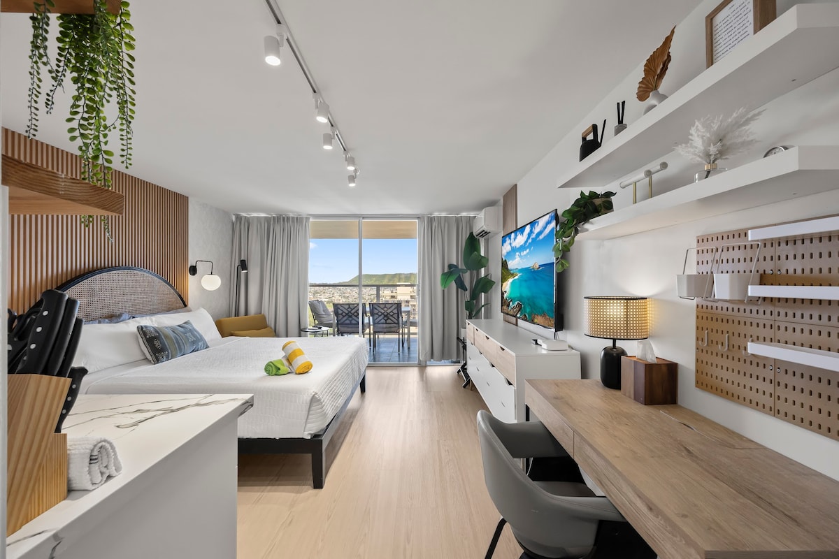 Gather your most precious Hawaii memories with this stunning boutique styled studio in the heart of Waikiki. Centrally located on Seaside Ave. with just minutes away from the world famous Waikiki beach, shopping plazas and fine dining. Enjoy a large 65” HD4K TV, split AC system, a King size bed with cloud like memory foam mattress and a spacious private balcony with canal and mountain view’s. This studio suite is the best choice for couples, small traveling groups and families. Aloha!~