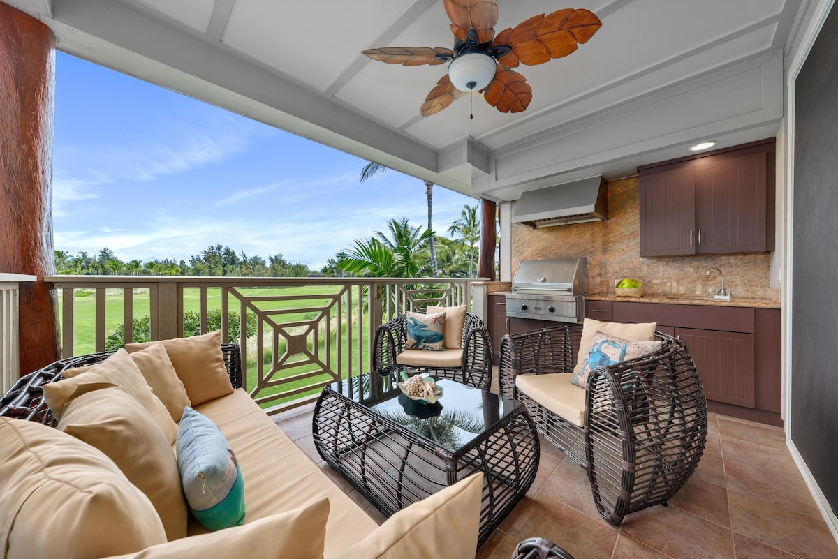 Short walk to beach \ shopping from this upgraded ground-level unit that blends modern design with an island vibe. Living room flows into a fully equipped chef's kitchen and opens to a lanai (balcony) with stunning views of the golf course, lake, plaza, sunsets every evening. Beach gear, baby essentials provided. Each room has king-sized beds, TV, ceiling fans, air conditioning, and blackout shades. Resort-style amenities, including a heated pool, gym, hot tub, and outdoor kitchen.