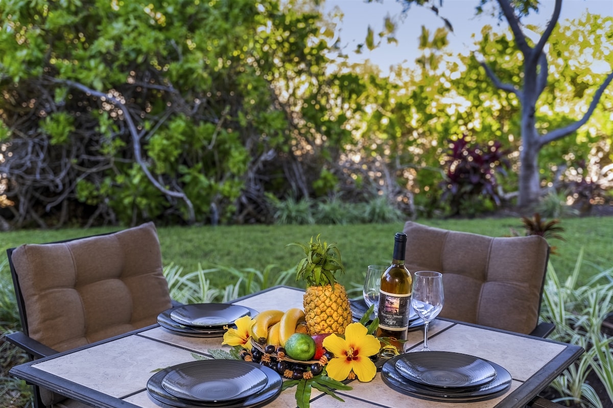 Upgraded 1st-floor condo in a gated community, steps from shops, dining & beach. Features new floors, kitchen, bathrooms, & designer decor. King beds, premium cotton linens, full AC, & stocked kitchen. Baby gear & beds for all ages. Enjoy a heated pool, gym, BBQs, & a hot tub. Relax on the lanai with golf course & sunset views, plus easy access to a lush lawn. Includes beach gear & fast Wi-Fi. Walk to A-Bay, Starbucks, Island Gourmet, & more. Perfect for a luxury getaway on the Kohala Coast.