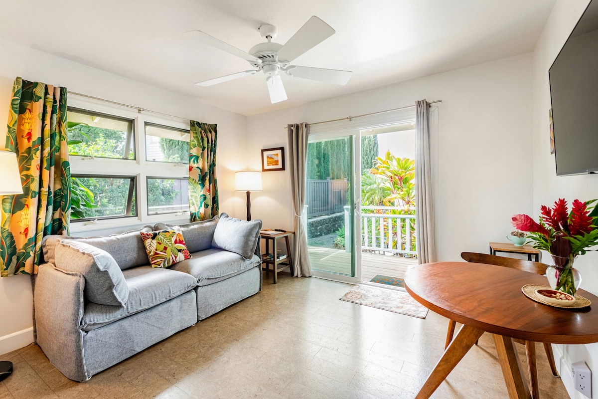 Aloha and E Komo Mai! (Welcome) Our Tranquililty Ohana is beautifully decorated in vintage tropical style in a very quiet neighborhood and offers you your own private and cozy space to kick back and relax. Window seats offer a nice nook for reading. Wake up to birds singing and enjoy morning coffee or tea on your own private lanai while enjoying the beautiful garden landscape. Please enjoy using our beach gear at the most beautiful white sand beaches on the island, as close as 15 minutes away.