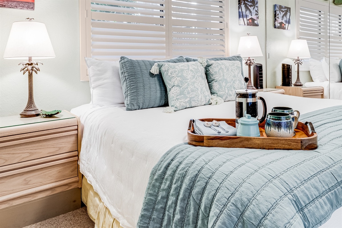 Steps to the beach, restaurants, shopping, coffee, sunset views. Roomy condo, large sofa and king bed. Steps to the pool, sauna, and hot tub and grill area. Quiet, off the main street location, but easy walk to everything, even a health food store! AC, floor fan, and ceiling fans. Large kitchen, fresh, remodeled bath, new Koa floors in MB, stone floors in living areas. Free parking on site. GE116536524801 TE116536524801
