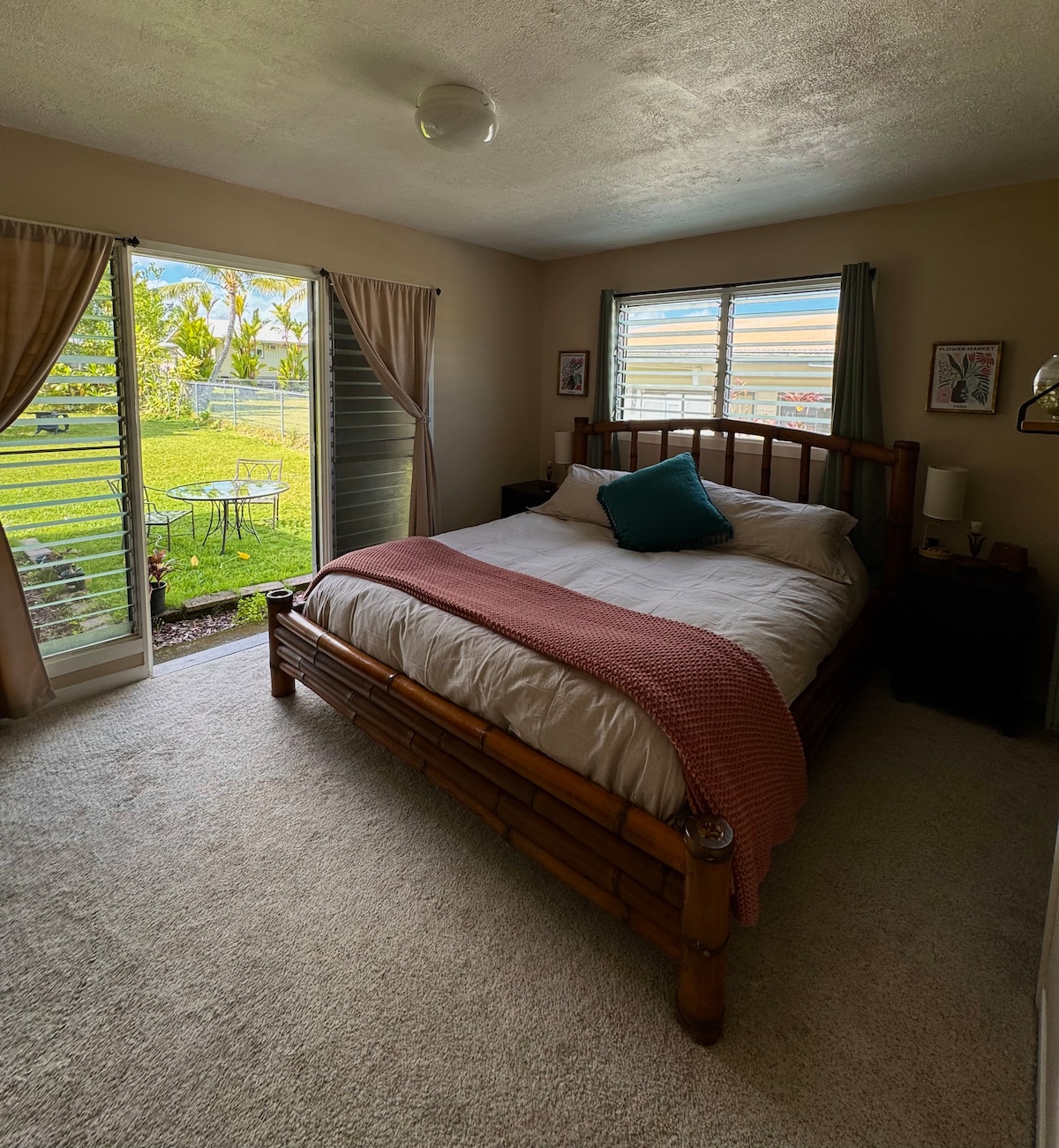 Open air Ohana, built off the lanai, located close to town making it easy to plan your visit. This ample space for two is located only four miles from the airport, seven minutes to the heart of downtown Hilo, Saddle road, Walmart, Safeway or the Hilo mall. Walk up the hill to the park, a safe area equip with a basketball court and playground, or not too far away venture to rainbow falls, boiling pots or Kaumana caves. A relaxing, breezy space allowing for a peaceful vacation or business travel